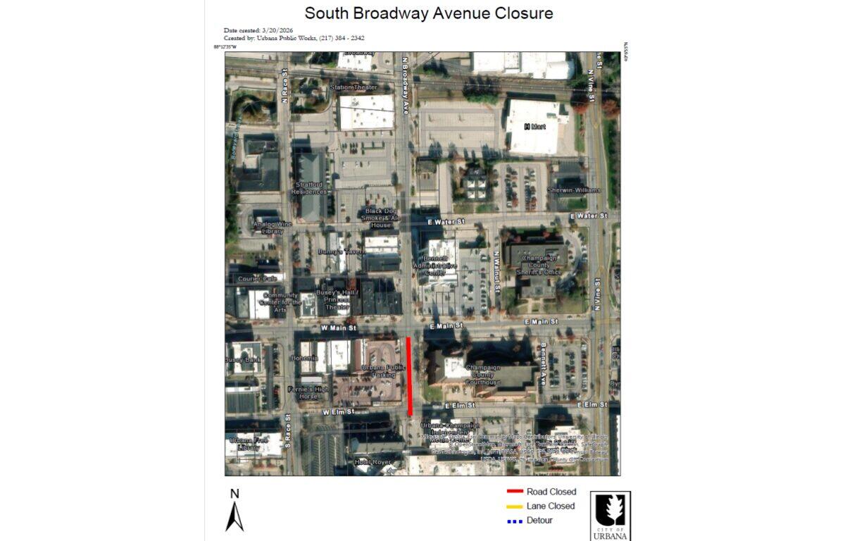 URBANA, IL (Chambana Today) — South Broadway Avenue will be closed from Main Street to Elm Street in Urbana for a portion of next week.